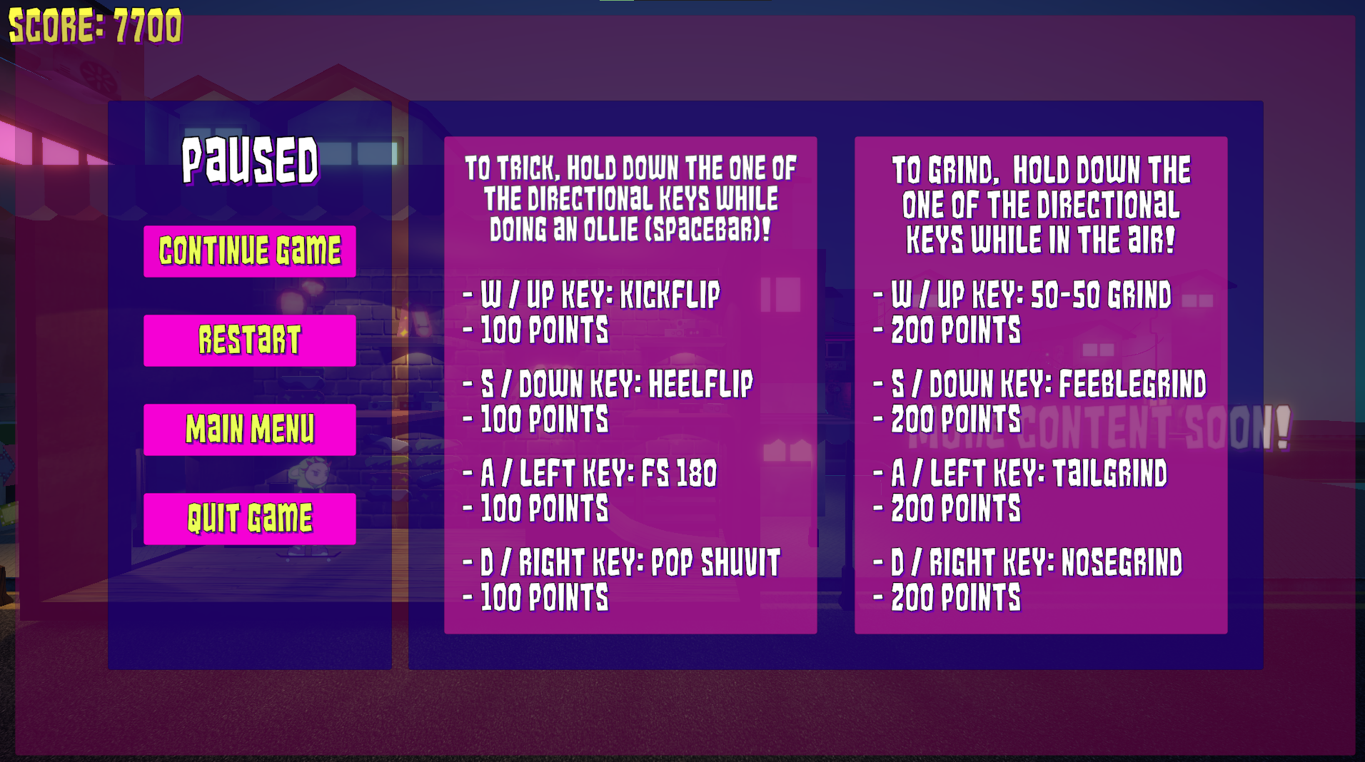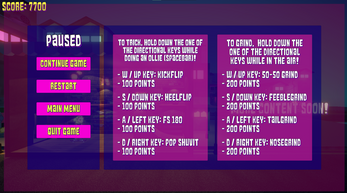 Learn and upgrade tricks (kickflip, manuals, grinds). Link them into combos to multiply your score.